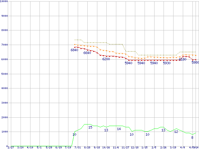 Athlon II X2 245 (2.9GHz,L2 1MB×2,TDP 65W)の価格推移↑前グラフ↓次グラフ(2009年2月27日〜2010年5月14日)※このグラフは過去のデータも税率5%相当に調整した税込み相当額のグラフです。●関連グラフCPU主要製品の最安値推移CPU主要製品(最安値1万円未満)の最安値推移AMD系CPUの最安値推移Socket AM3 (Dual Core)の最安値推移●凡例最安値(点線部は販売店未確認または未調査)平均値最高値ショップ数