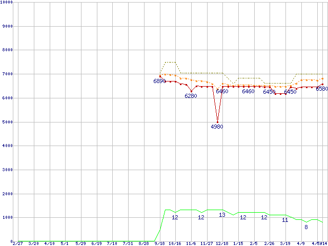 Athlon II X2 235e (2.7GHz,L2 1MB×2,TDP 45W)の価格推移↑前グラフ↓次グラフ(2009年2月27日〜2010年5月14日)※このグラフは過去のデータも税率5%相当に調整した税込み相当額のグラフです。●関連グラフCPU主要製品の最安値推移CPU主要製品(最安値1万円未満)の最安値推移AMD系CPUの最安値推移Socket AM3 (Dual Core)の最安値推移●凡例最安値(点線部は販売店未確認または未調査)平均値最高値ショップ数