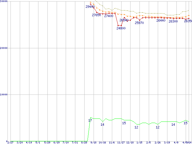 Core i7-860 (2.80GHz)の価格推移↑前グラフ↓次グラフ(2009年2月27日〜2010年5月14日)※このグラフは過去のデータも税率5%相当に調整した税込み相当額のグラフです。●関連グラフCPU主要製品の最安値推移CPU主要製品(最安値2万円〜3万円未満)の最安値推移Intel系CPUの最安値推移LGA1156 (L3キャッシュ8MB,Quad Core,Hyper-Threading,TDP 82〜95W)の最安値推移●凡例最安値(点線部は販売店未確認または未調査)平均値最高値ショップ数