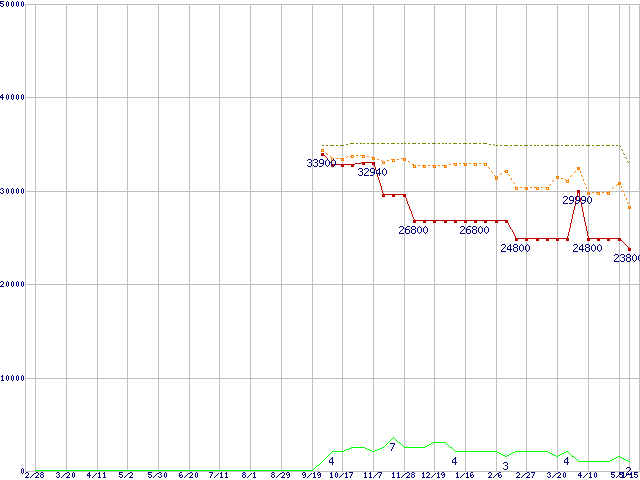 PC2-6400 4GB×2枚組みセットの価格推移↑前グラフ↓次グラフ(2009年2月28日〜2010年5月15日)※このグラフは過去のデータも税率5%相当に調整した税込み相当額のグラフです。 税率変更や、総額表示方式導入(2004年4月)の影響は除いています。●関連グラフメモリ主要製品の最安値推移メモリ主要製品(最安値1万円以上)の最安値推移PC2-6400(DDR2-800) DDR2 SDRAM DIMMの最安値推移●凡例最安値(点線部は販売店未確認または未調査)平均値最高値ショップ数