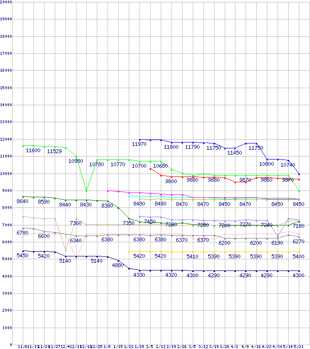 CPU主要製品(最安値1万円未満)の最安値推移↑前グラフ↓次グラフ(2009年11月6日〜2010年5月21日)※このグラフは過去のデータも税率5%相当に調整した税込み相当額のグラフです。凡例Athlon II X4 635 (2.9GHz,L2 512KB×4,TDP 95W)Phenom II X2 555 Black Edition (3.2GHz,L2 512KB×2,L3 6MB)Athlon II X4 630 (2.8GHz,L2 512KB×4,TDP 95W)Pentium G6950 (2.8GHz)Pentium E6600 (3.06GHz,L2 2MB)Athlon II X3 440 (3.0GHz,L2 512KB×3,TDP 95W)Athlon II X2 255 (3.1GHz,L2 1MB×2,TDP 65W)Athlon II X2 240e (2.8GHz,L2 1MB×2,TDP 45W)Pentium E6500 (2.93GHz,L2 2MB)Athlon II X2 235e (2.7GHz,L2 1MB×2,TDP 45W)Athlon II X2 250 (3.0GHz,L2 1MB×2,TDP 65W)Celeron E3400 (2.6GHz)Celeron E3300 (2.5GHz)※製品名をクリックすると個別のグラフを表示します※点線部は販売店が確認できなかった、または調査データがないことを示します