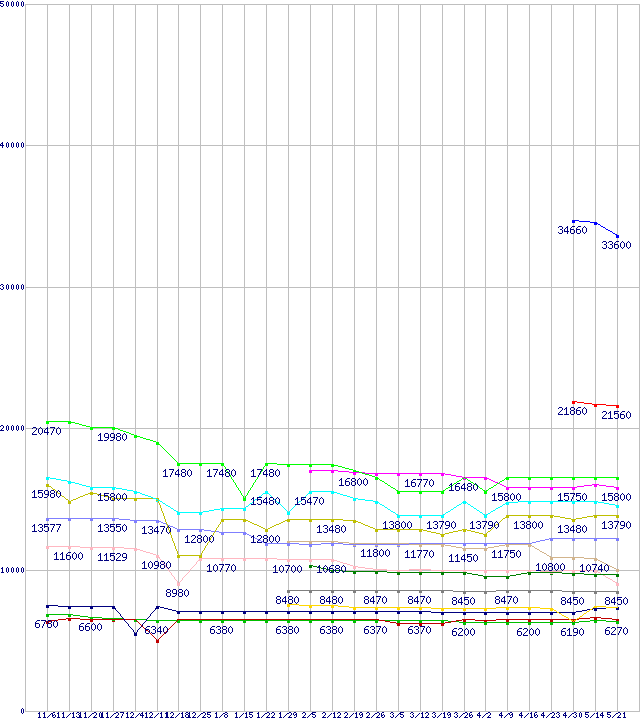 AMD系CPUの最安値推移↑前グラフ↓次グラフ(2009年11月6日〜2010年5月21日)※このグラフは過去のデータも税率5%相当に調整した税込み相当額のグラフです。凡例Phenom II X6 1090T Black Edition (3.2GHz,L2 512KB×6,L3 6MB,TDP 125W)Phenom II X6 1055T (2.8GHz,L2 512KB×6,L3 6MB,TDP 125W)Phenom II X4 965 Black Edition (3.4GHz,L2 512KB×4,L3 6MB,TDP 125W)Phenom II X4 910e (2.6GHz,L2 512KB×4,L3 6MB,TDP 65W)Phenom II X4 955 Black Edition (3.2GHz,L2 512KB×4,L3 6MB,TDP 125W)Phenom II X4 945 (3.0GHz,L2 512KB×4,L3 6MB,TDP 95W)Athlon II X4 605e (2.3GHz,L2 512KB×4,TDP 45W)Athlon II X4 635 (2.9GHz,L2 512KB×4,TDP 95W)Phenom II X2 555 Black Edition (3.2GHz,L2 512KB×2,L3 6MB)Athlon II X4 630 (2.8GHz,L2 512KB×4,TDP 95W)Athlon II X3 440 (3.0GHz,L2 512KB×3,TDP 95W)Athlon II X2 255 (3.1GHz,L2 1MB×2,TDP 65W)Athlon II X2 240e (2.8GHz,L2 1MB×2,TDP 45W)Athlon II X2 235e (2.7GHz,L2 1MB×2,TDP 45W)Athlon II X2 250 (3.0GHz,L2 1MB×2,TDP 65W)※製品名をクリックすると個別のグラフを表示します※点線部は販売店が確認できなかった、または調査データがないことを示します