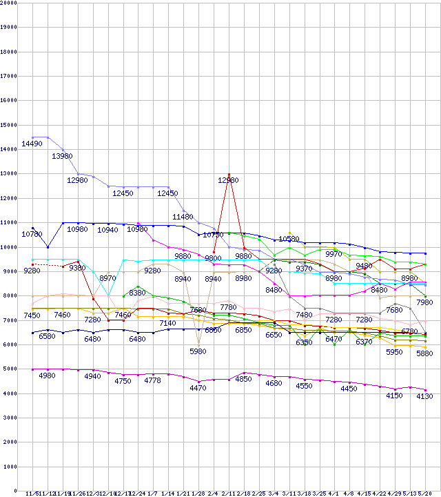 | HDD/SSD主要製品(最安値1万円未満)の最安値推移 |