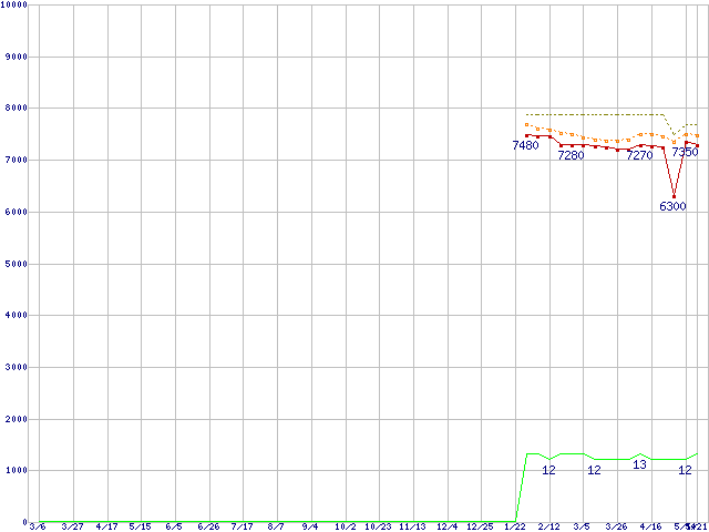 Athlon II X2 255 (3.1GHz,L2 1MB×2,TDP 65W)の価格推移↑前グラフ↓次グラフ(2009年3月6日〜2010年5月21日)※このグラフは過去のデータも税率5%相当に調整した税込み相当額のグラフです。●関連グラフCPU主要製品の最安値推移CPU主要製品(最安値1万円未満)の最安値推移AMD系CPUの最安値推移Socket AM3 (Dual Core)の最安値推移●凡例最安値(点線部は販売店未確認または未調査)平均値最高値ショップ数