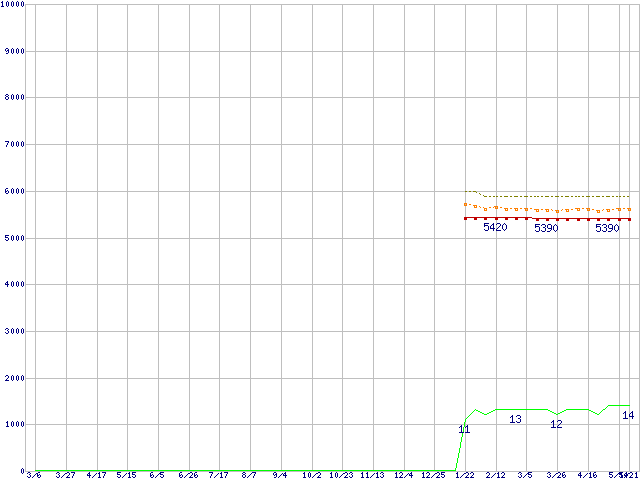 Celeron E3400 (2.6GHz)の価格推移↑前グラフ↓次グラフ(2009年3月6日〜2010年5月21日)※このグラフは過去のデータも税率5%相当に調整した税込み相当額のグラフです。●関連グラフCPU主要製品の最安値推移CPU主要製品(最安値1万円未満)の最安値推移Intel系CPUの最安値推移LGA775 (FSB 800MHz,L2 1MB,Dual Core,TDP 65W)の最安値推移●凡例最安値(点線部は販売店未確認または未調査)平均値最高値ショップ数