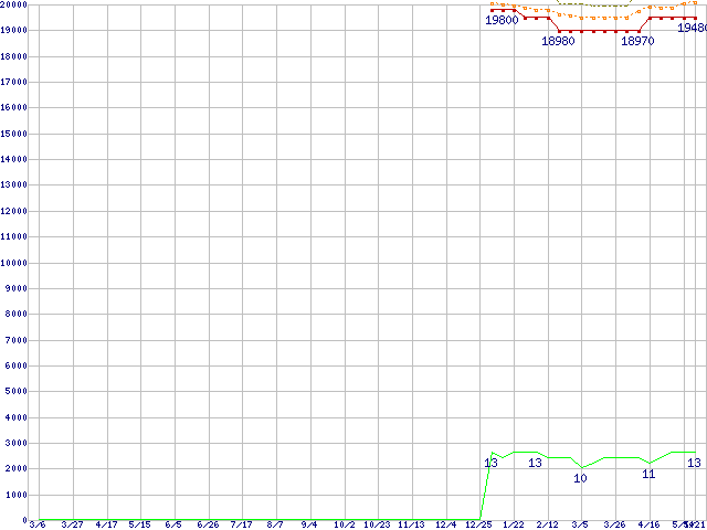 Core i5-661 (3.33GHz)の価格推移↑前グラフ↓次グラフ(2009年3月6日〜2010年5月21日)※このグラフは過去のデータも税率5%相当に調整した税込み相当額のグラフです。●関連グラフCPU主要製品の最安値推移CPU主要製品(最安値1万円〜2万円未満)の最安値推移Intel系CPUの最安値推移LGA1156 (L3キャッシュ4MB,Dual Core,GPU内蔵,Hyper-Threading,TDP 73〜87W)の最安値推移●凡例最安値(点線部は販売店未確認または未調査)平均値最高値ショップ数