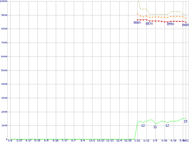Pentium E6600 (3.06GHz,L2 2MB)の価格推移↑前グラフ↓次グラフ(2009年3月6日〜2010年5月21日)※このグラフは過去のデータも税率5%相当に調整した税込み相当額のグラフです。●関連グラフCPU主要製品の最安値推移CPU主要製品(最安値1万円未満)の最安値推移Intel系CPUの最安値推移LGA775 (FSB 1066MHz,Dual Core,TDP 65W)の最安値推移●凡例最安値(点線部は販売店未確認または未調査)平均値最高値ショップ数