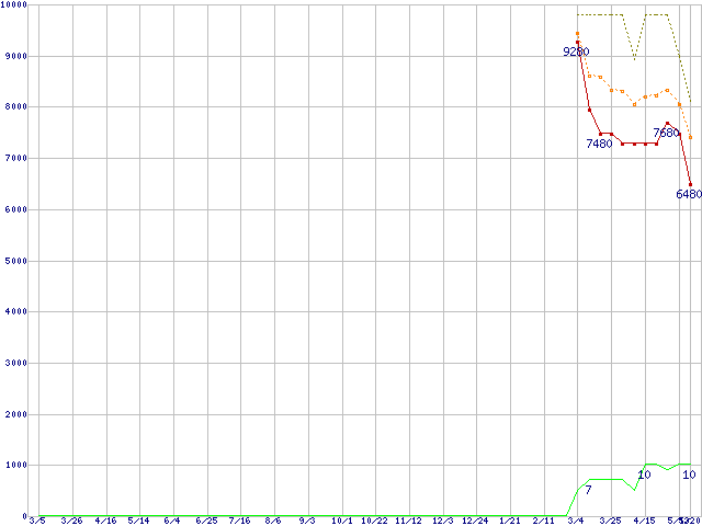 WD10EALS (1TB,32MB)の価格推移↑前グラフ↓次グラフ(2009年3月5日〜2010年5月20日)※このグラフは過去のデータも税率5%相当に調整した税込み相当額のグラフです。 税率変更や、総額表示方式導入(2004年4月)の影響は除いています。●関連グラフHDD/SSD主要製品の最安値推移HDD/SSD主要製品(最安値1万円未満)の最安値推移HDD 1TB〜1.5TB未満の最安値推移WD Caviar Blue (7200rpm,3Gb/s)の最安値推移●凡例最安値(点線部は販売店未確認または未調査)平均値最高値ショップ数