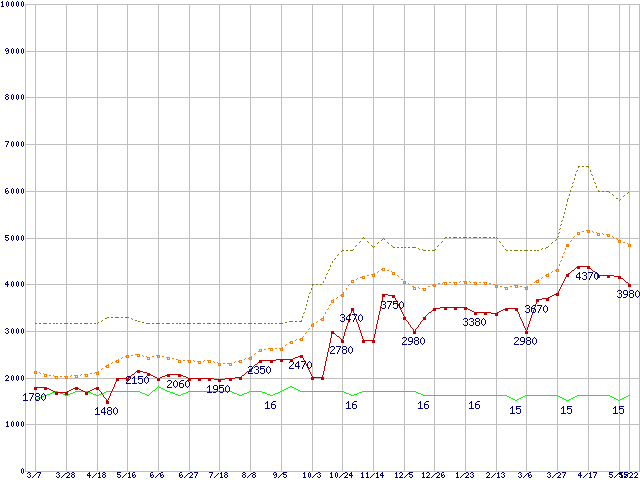 PC2-6400 2GBの価格推移↑前グラフ↓次グラフ(2009年3月7日〜2010年5月22日)※このグラフは過去のデータも税率5%相当に調整した税込み相当額のグラフです。 税率変更や、総額表示方式導入(2004年4月)の影響は除いています。●関連グラフメモリ主要製品の最安値推移2GBモジュール/1GBモジュール×2枚の最安値推移メモリ主要製品(最安値5千円未満)の最安値推移PC2-6400(DDR2-800) DDR2 SDRAM DIMMの最安値推移●凡例最安値(点線部は販売店未確認または未調査)平均値最高値ショップ数