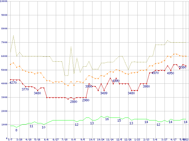 PC3-10600 1GB×2枚組みセットの価格推移↑前グラフ↓次グラフ(2009年3月7日〜2010年5月22日)※このグラフは過去のデータも税率5%相当に調整した税込み相当額のグラフです。 税率変更や、総額表示方式導入(2004年4月)の影響は除いています。●関連グラフメモリ主要製品の最安値推移2GBモジュール/1GBモジュール×2枚の最安値推移メモリ主要製品(最安値5千円〜1万円未満)の最安値推移PC3-10600(DDR3-1333) DDR3 SDRAM DIMMの最安値推移●凡例最安値(点線部は販売店未確認または未調査)平均値最高値ショップ数
