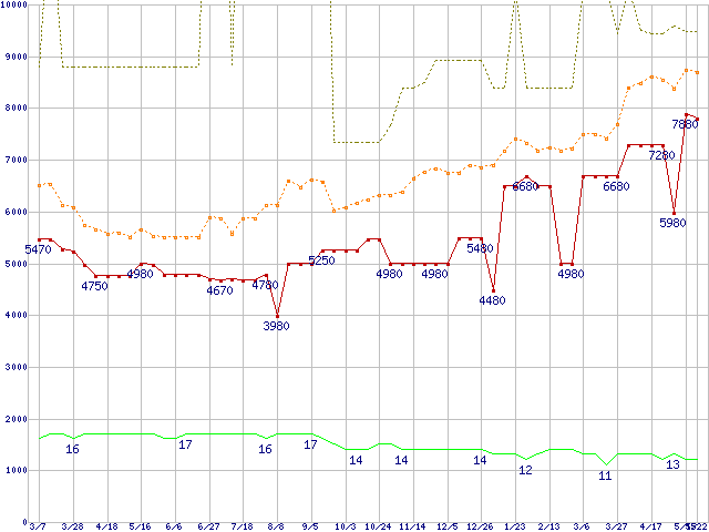 PC3-10600 1GB×3枚組みセットの価格推移↑前グラフ↓次グラフ(2009年3月7日〜2010年5月22日)※このグラフは過去のデータも税率5%相当に調整した税込み相当額のグラフです。 税率変更や、総額表示方式導入(2004年4月)の影響は除いています。●関連グラフメモリ主要製品の最安値推移メモリ主要製品(最安値5千円〜1万円未満)の最安値推移PC3-10600(DDR3-1333) DDR3 SDRAM DIMMの最安値推移●凡例最安値(点線部は販売店未確認または未調査)平均値最高値ショップ数