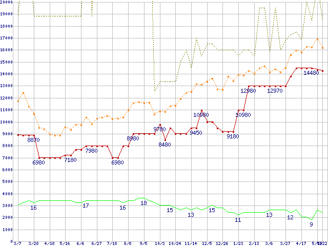 PC3-10600 2GB×3枚組みセットの価格推移↑前グラフ↓次グラフ(2009年3月7日〜2010年5月22日)※このグラフは過去のデータも税率5%相当に調整した税込み相当額のグラフです。 税率変更や、総額表示方式導入(2004年4月)の影響は除いています。●関連グラフメモリ主要製品の最安値推移メモリ主要製品(最安値1万円以上)の最安値推移PC3-10600(DDR3-1333) DDR3 SDRAM DIMMの最安値推移●凡例最安値(点線部は販売店未確認または未調査)平均値最高値ショップ数