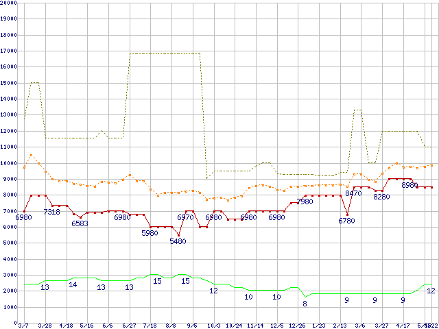 PC3-12800 1GB×3枚組みセットの価格推移↑前グラフ↓次グラフ(2009年3月7日〜2010年5月22日)※このグラフは過去のデータも税率5%相当に調整した税込み相当額のグラフです。 税率変更や、総額表示方式導入(2004年4月)の影響は除いています。●関連グラフメモリ主要製品の最安値推移メモリ主要製品(最安値5千円〜1万円未満)の最安値推移PC3-12800(DDR3-1600) DDR3 SDRAM DIMMの最安値推移●凡例最安値(点線部は販売店未確認または未調査)平均値最高値ショップ数