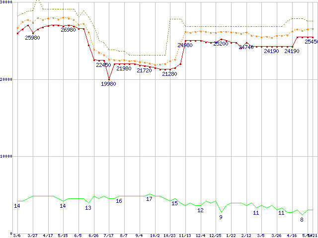 Core 2 Quad Q9550 (2.83GHz,L2 6MB×2)の価格推移↑前グラフ↓次グラフ(2009年3月6日〜2010年5月21日)※このグラフは過去のデータも税率5%相当に調整した税込み相当額のグラフです。●関連グラフCPU主要製品の最安値推移CPU主要製品(最安値2万円〜3万円未満)の最安値推移Intel系CPUの最安値推移LGA775 (FSB 1333MHz,Quad Core,TDP 95W)の最安値推移●凡例最安値(点線部は販売店未確認または未調査)平均値最高値ショップ数