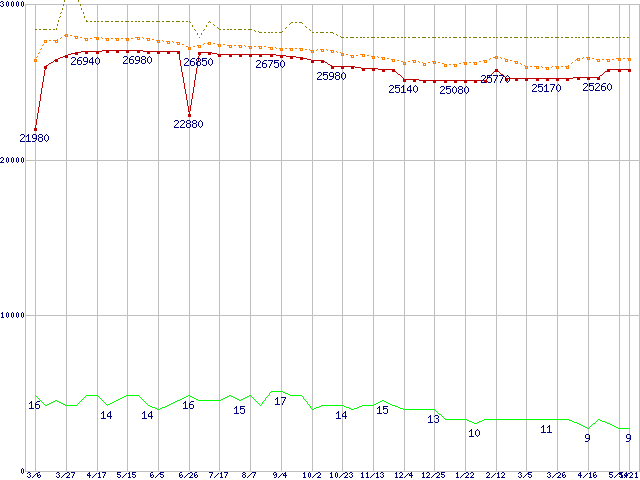 Core 2 Duo E8600 (3.33GHz,L2 6MB)の価格推移↓次グラフ(2009年3月6日〜2010年5月21日)※このグラフは過去のデータも税率5%相当に調整した税込み相当額のグラフです。●関連グラフCPU主要製品の最安値推移CPU主要製品(最安値2万円〜3万円未満)の最安値推移Intel系CPUの最安値推移LGA775 (FSB 1333MHz,Dual Core,TDP 65W)の最安値推移●凡例最安値(点線部は販売店未確認または未調査)平均値最高値ショップ数