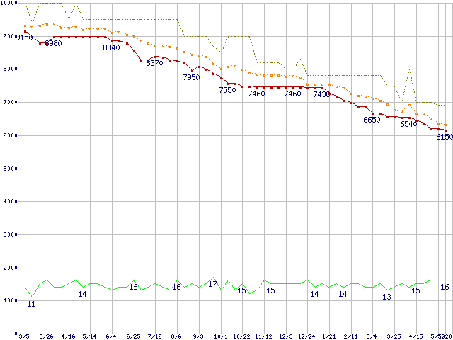 WD5000BEVT (500GB,8MB)の価格推移↑前グラフ↓次グラフ(2009年3月5日〜2010年5月20日)※このグラフは過去のデータも税率5%相当に調整した税込み相当額のグラフです。 税率変更や、総額表示方式導入(2004年4月)の影響は除いています。●関連グラフHDD/SSD主要製品の最安値推移HDD/SSD主要製品(最安値1万円未満)の最安値推移HDD 500〜600GB未満の最安値推移WD Scorpio Blue (5200〜5400rpm,3Gb/s,2.5インチ)の最安値推移●凡例最安値(点線部は販売店未確認または未調査)平均値最高値ショップ数