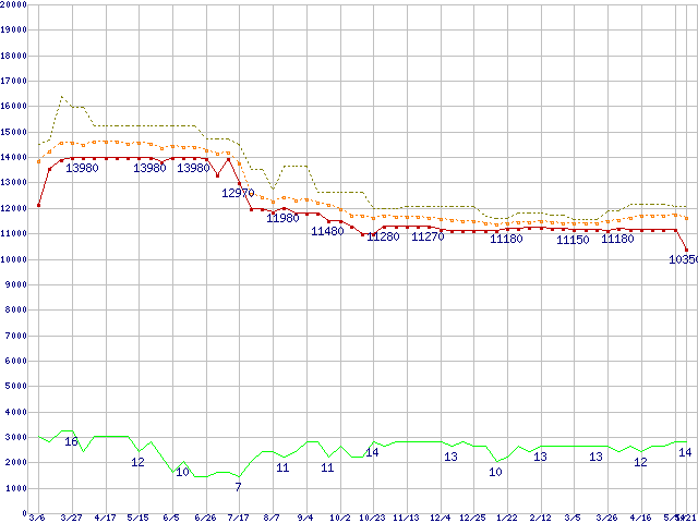 Core 2 Duo E7500 (2.93GHz,L2 3MB)の価格推移↑前グラフ↓次グラフ(2009年3月6日〜2010年5月21日)※このグラフは過去のデータも税率5%相当に調整した税込み相当額のグラフです。●関連グラフCPU主要製品の最安値推移CPU主要製品(最安値1万円〜2万円未満)の最安値推移Intel系CPUの最安値推移LGA775 (FSB 1066MHz,Dual Core,TDP 65W)の最安値推移●凡例最安値(点線部は販売店未確認または未調査)平均値最高値ショップ数
