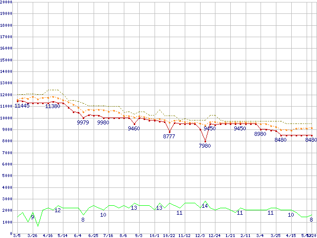 HD154UI (1.5TB,32MB)の価格推移↑前グラフ↓次グラフ(2009年3月5日〜2010年5月20日)※このグラフは過去のデータも税率5%相当に調整した税込み相当額のグラフです。 税率変更や、総額表示方式導入(2004年4月)の影響は除いています。●関連グラフHDD/SSD主要製品の最安値推移HDD/SSD主要製品(最安値1万円未満)の最安値推移HDD 1.5TB〜2TB未満の最安値推移EcoGreen F2 (5400rpm,3Gb/s)の最安値推移●凡例最安値(点線部は販売店未確認または未調査)平均値最高値ショップ数