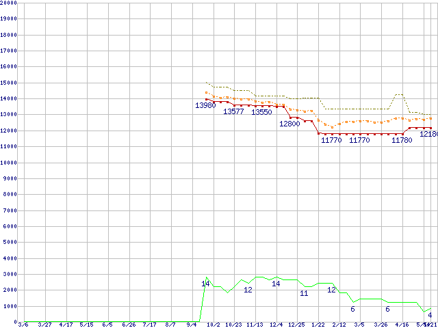 Athlon II X4 605e (2.3GHz,L2 512KB×4,TDP 45W)の価格推移↑前グラフ↓次グラフ(2009年3月6日〜2010年5月21日)※このグラフは過去のデータも税率5%相当に調整した税込み相当額のグラフです。●関連グラフCPU主要製品の最安値推移CPU主要製品(最安値1万円〜2万円未満)の最安値推移AMD系CPUの最安値推移Socket AM3 (Quad Core)の最安値推移●凡例最安値(点線部は販売店未確認または未調査)平均値最高値ショップ数