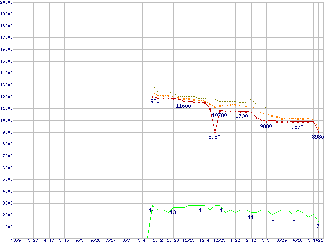 Athlon II X4 630 (2.8GHz,L2 512KB×4,TDP 95W)の価格推移↑前グラフ↓次グラフ(2009年3月6日〜2010年5月21日)※このグラフは過去のデータも税率5%相当に調整した税込み相当額のグラフです。●関連グラフCPU主要製品の最安値推移CPU主要製品(最安値1万円未満)の最安値推移AMD系CPUの最安値推移Socket AM3 (Quad Core)の最安値推移●凡例最安値(点線部は販売店未確認または未調査)平均値最高値ショップ数