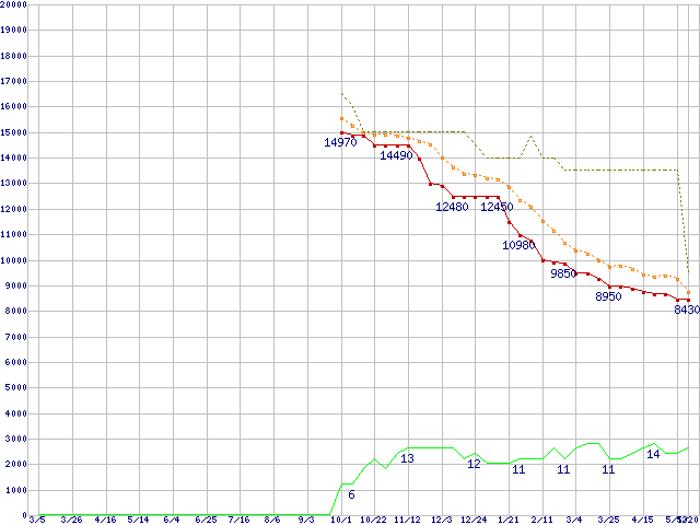 WD6400BEVT (640GB,8MB)の価格推移↑前グラフ↓次グラフ(2009年3月5日〜2010年5月20日)※このグラフは過去のデータも税率5%相当に調整した税込み相当額のグラフです。 税率変更や、総額表示方式導入(2004年4月)の影響は除いています。●関連グラフHDD/SSD主要製品の最安値推移HDD/SSD主要製品(最安値1万円未満)の最安値推移HDD 600〜750GB未満の最安値推移WD Scorpio Blue (5200〜5400rpm,3Gb/s,2.5インチ)の最安値推移●凡例最安値(点線部は販売店未確認または未調査)平均値最高値ショップ数