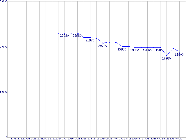 | X25-M(G2) (SSD,3Gb/s,2.5インチ,リード250MB/s・ライト70MB/s)の最安値推移 |