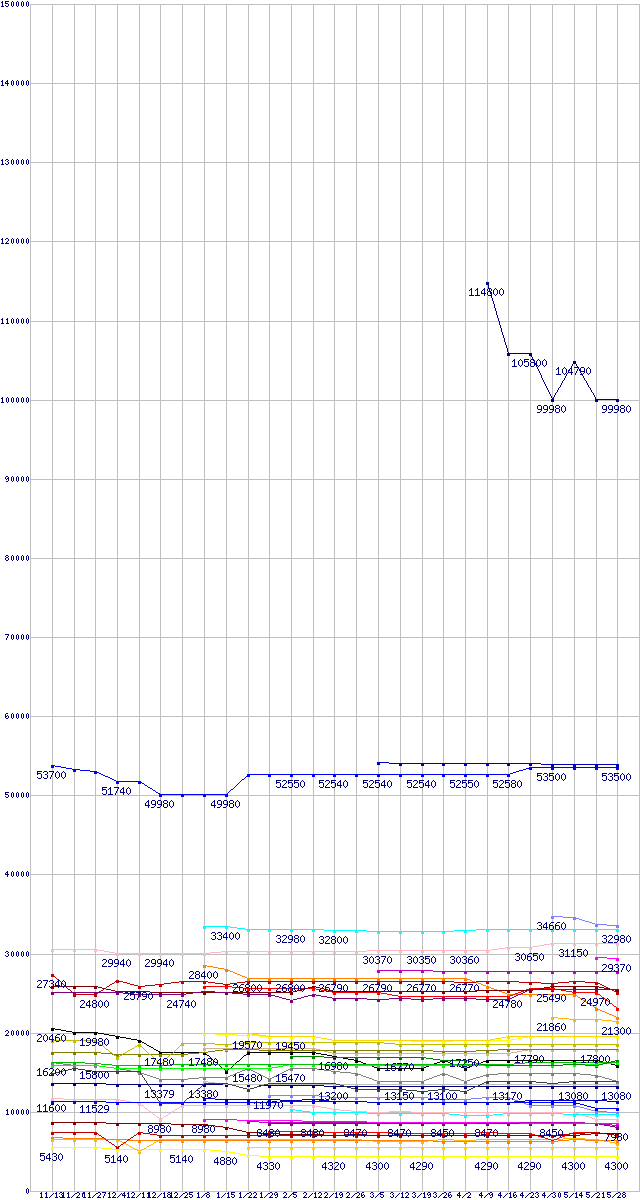 CPU主要製品の最安値推移↑前グラフ↓次グラフ(2009年11月13日〜2010年5月28日)※このグラフは過去のデータも税率5%相当に調整した税込み相当額のグラフです。凡例Core i7-980X Extreme Edition (3.33GHz)Core i7-960 (3.20GHz)Core i7-870 (2.93GHz)Phenom II X6 1090T Black Edition (3.2GHz,L2 512KB×6,L3 6MB,TDP 125W)Core i7-860S (2.53GHz)Core 2 Quad Q9650 (3.00GHz,L2 6MB×2)Core i5-680 (3.6GHz)Core i7-930 (2.80GHz)Core 2 Quad Q9550 (2.83GHz,L2 6MB×2)Core 2 Duo E8600 (3.33GHz,L2 6MB)Core i7-860 (2.80GHz)Core i5-750S (2.4GHz)Core i5-670 (3.46GHz)Phenom II X6 1055T (2.8GHz,L2 512KB×6,L3 6MB,TDP 125W)Core i5-661 (3.33GHz)Core i5-660 (3.33GHz)Core i5-750 (2.66GHz)Core 2 Duo E8500 (3.16GHz,L2 6MB)Core i5-650 (3.2GHz)Phenom II X4 910e (2.6GHz,L2 512KB×4,L3 6MB,TDP 65W)Core 2 Quad Q8400 (2.66GHz,L2 2MB×2)Core 2 Duo E8400 (3GHz,L2 6MB)Phenom II X4 965 Black Edition (3.4GHz,L2 512KB×4,L3 6MB,TDP 125W)Phenom II X4 945 (3.0GHz,L2 512KB×4,L3 6MB,TDP 95W)Phenom II X4 955 Black Edition (3.2GHz,L2 512KB×4,L3 6MB,TDP 125W)Core i3-540 (3.06GHz)Core 2 Duo E7600 (3.06GHz,L2 3MB)Core i3-530 (2.93GHz)Core 2 Duo E7500 (2.93GHz,L2 3MB)Athlon II X4 635 (2.9GHz,L2 512KB×4,TDP 95W)Phenom II X2 555 Black Edition (3.2GHz,L2 512KB×2,L3 6MB)Athlon II X4 630 (2.8GHz,L2 512KB×4,TDP 95W)Pentium G6950 (2.8GHz)Pentium E6600 (3.06GHz,L2 2MB)Athlon II X3 440 (3.0GHz,L2 512KB×3,TDP 95W)Pentium E6500 (2.93GHz,L2 2MB)Athlon II X2 240e (2.8GHz,L2 1MB×2,TDP 45W)Athlon II X2 255 (3.1GHz,L2 1MB×2,TDP 65W)Athlon II X2 250 (3.0GHz,L2 1MB×2,TDP 65W)Athlon II X2 235e (2.7GHz,L2 1MB×2,TDP 45W)Celeron E3400 (2.6GHz)Celeron E3300 (2.5GHz)※製品名をクリックすると個別のグラフを表示します※点線部は販売店が確認できなかった、または調査データがないことを示します