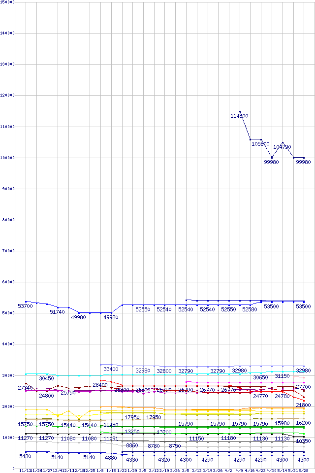 Intel系CPUの最安値推移↑前グラフ↓次グラフ(2009年11月13日〜2010年5月28日)※このグラフは過去のデータも税率5%相当に調整した税込み相当額のグラフです。凡例Core i7-980X Extreme Edition (3.33GHz)Core i7-960 (3.20GHz)Core i7-870 (2.93GHz)Core i7-860S (2.53GHz)Core 2 Quad Q9650 (3.00GHz,L2 6MB×2)Core i5-680 (3.6GHz)Core i7-930 (2.80GHz)Core 2 Quad Q9550 (2.83GHz,L2 6MB×2)Core 2 Duo E8600 (3.33GHz,L2 6MB)Core i7-860 (2.80GHz)Core i5-750S (2.4GHz)Core i5-670 (3.46GHz)Core i5-661 (3.33GHz)Core i5-660 (3.33GHz)Core i5-750 (2.66GHz)Core 2 Duo E8500 (3.16GHz,L2 6MB)Core i5-650 (3.2GHz)Core 2 Quad Q8400 (2.66GHz,L2 2MB×2)Core 2 Duo E8400 (3GHz,L2 6MB)Core i3-540 (3.06GHz)Core 2 Duo E7600 (3.06GHz,L2 3MB)Core i3-530 (2.93GHz)Core 2 Duo E7500 (2.93GHz,L2 3MB)Pentium G6950 (2.8GHz)Pentium E6600 (3.06GHz,L2 2MB)Pentium E6500 (2.93GHz,L2 2MB)Celeron E3400 (2.6GHz)Celeron E3300 (2.5GHz)※製品名をクリックすると個別のグラフを表示します※点線部は販売店が確認できなかった、または調査データがないことを示します