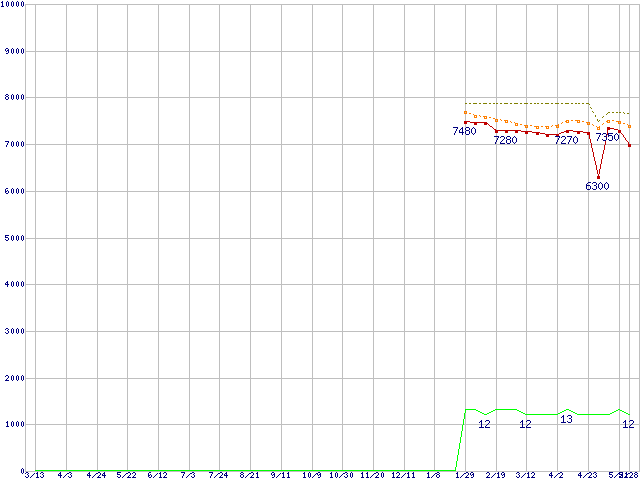 Athlon II X2 255 (3.1GHz,L2 1MB×2,TDP 65W)の価格推移↑前グラフ↓次グラフ(2009年3月13日〜2010年5月28日)※このグラフは過去のデータも税率5%相当に調整した税込み相当額のグラフです。●関連グラフCPU主要製品の最安値推移CPU主要製品(最安値1万円未満)の最安値推移AMD系CPUの最安値推移Socket AM3 (Dual Core)の最安値推移●凡例最安値(点線部は販売店未確認または未調査)平均値最高値ショップ数