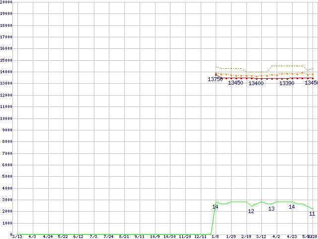 Core i3-540 (3.06GHz)の価格推移↑前グラフ↓次グラフ(2009年3月13日〜2010年5月28日)※このグラフは過去のデータも税率5%相当に調整した税込み相当額のグラフです。●関連グラフCPU主要製品の最安値推移CPU主要製品(最安値1万円〜2万円未満)の最安値推移Intel系CPUの最安値推移LGA1156 (L3キャッシュ4MB,Dual Core,GPU内蔵,Hyper-Threading,TDP 73〜87W)の最安値推移●凡例最安値(点線部は販売店未確認または未調査)平均値最高値ショップ数