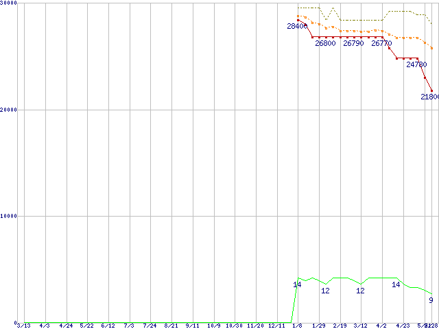 Core i5-670 (3.46GHz)の価格推移↑前グラフ↓次グラフ(2009年3月13日〜2010年5月28日)※このグラフは過去のデータも税率5%相当に調整した税込み相当額のグラフです。●関連グラフCPU主要製品の最安値推移CPU主要製品(最安値2万円〜3万円未満)の最安値推移Intel系CPUの最安値推移LGA1156 (L3キャッシュ4MB,Dual Core,GPU内蔵,Hyper-Threading,TDP 73〜87W)の最安値推移●凡例最安値(点線部は販売店未確認または未調査)平均値最高値ショップ数