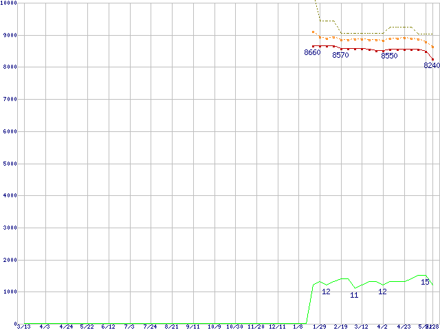 Pentium E6600 (3.06GHz,L2 2MB)の価格推移↑前グラフ↓次グラフ(2009年3月13日〜2010年5月28日)※このグラフは過去のデータも税率5%相当に調整した税込み相当額のグラフです。●関連グラフCPU主要製品の最安値推移CPU主要製品(最安値1万円未満)の最安値推移Intel系CPUの最安値推移LGA775 (FSB 1066MHz,Dual Core,TDP 65W)の最安値推移●凡例最安値(点線部は販売店未確認または未調査)平均値最高値ショップ数
