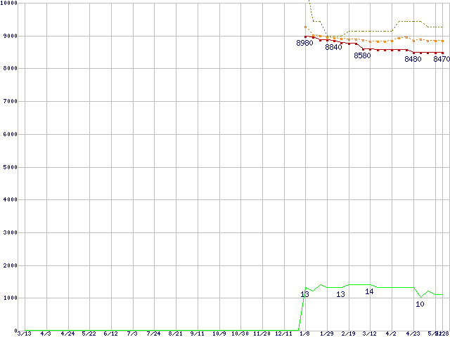 Pentium G6950 (2.8GHz)の価格推移↑前グラフ↓次グラフ(2009年3月13日〜2010年5月28日)※このグラフは過去のデータも税率5%相当に調整した税込み相当額のグラフです。●関連グラフCPU主要製品の最安値推移CPU主要製品(最安値1万円未満)の最安値推移Intel系CPUの最安値推移LGA1156 (L3キャッシュ3MB,Dual Core,GPU内蔵,TDP 73W)の最安値推移●凡例最安値(点線部は販売店未確認または未調査)平均値最高値ショップ数