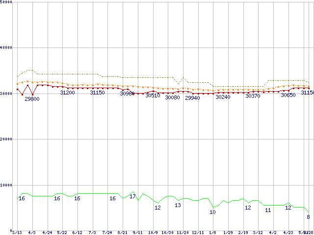 Core 2 Quad Q9650 (3.00GHz,L2 6MB×2)の価格推移↑前グラフ↓次グラフ(2009年3月13日〜2010年5月28日)※このグラフは過去のデータも税率5%相当に調整した税込み相当額のグラフです。●関連グラフCPU主要製品の最安値推移CPU主要製品(最安値3万円〜6万円未満)の最安値推移Intel系CPUの最安値推移LGA775 (FSB 1333MHz,Quad Core,TDP 95W)の最安値推移●凡例最安値(点線部は販売店未確認または未調査)平均値最高値ショップ数