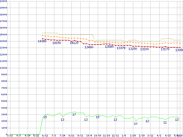 Core 2 Duo E7600 (3.06GHz,L2 3MB)の価格推移↑前グラフ↓次グラフ(2009年3月13日〜2010年5月28日)※このグラフは過去のデータも税率5%相当に調整した税込み相当額のグラフです。●関連グラフCPU主要製品の最安値推移CPU主要製品(最安値1万円〜2万円未満)の最安値推移Intel系CPUの最安値推移LGA775 (FSB 1066MHz,Dual Core,TDP 65W)の最安値推移●凡例最安値(点線部は販売店未確認または未調査)平均値最高値ショップ数