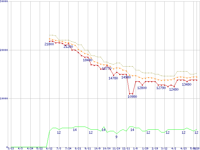 Phenom II X4 945 (3.0GHz,L2 512KB×4,L3 6MB,TDP 95W)の価格推移↑前グラフ↓次グラフ(2009年3月13日〜2010年5月28日)※このグラフは過去のデータも税率5%相当に調整した税込み相当額のグラフです。●関連グラフCPU主要製品の最安値推移CPU主要製品(最安値1万円〜2万円未満)の最安値推移AMD系CPUの最安値推移Socket AM3 (HyperTransport 3.0,Quad Core)の最安値推移●凡例最安値(点線部は販売店未確認または未調査)平均値最高値ショップ数