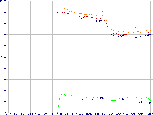 Pentium E6500 (2.93GHz,L2 2MB)の価格推移↑前グラフ↓次グラフ(2009年3月13日〜2010年5月28日)※このグラフは過去のデータも税率5%相当に調整した税込み相当額のグラフです。●関連グラフCPU主要製品の最安値推移CPU主要製品(最安値1万円未満)の最安値推移Intel系CPUの最安値推移LGA775 (FSB 1066MHz,Dual Core,TDP 65W)の最安値推移●凡例最安値(点線部は販売店未確認または未調査)平均値最高値ショップ数