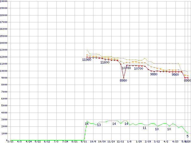 Athlon II X4 630 (2.8GHz,L2 512KB×4,TDP 95W)の価格推移↑前グラフ↓次グラフ(2009年3月13日〜2010年5月28日)※このグラフは過去のデータも税率5%相当に調整した税込み相当額のグラフです。●関連グラフCPU主要製品の最安値推移CPU主要製品(最安値1万円未満)の最安値推移AMD系CPUの最安値推移Socket AM3 (Quad Core)の最安値推移●凡例最安値(点線部は販売店未確認または未調査)平均値最高値ショップ数