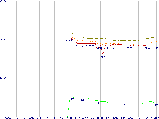 Core i5-750 (2.66GHz)の価格推移↑前グラフ↓次グラフ(2009年3月13日〜2010年5月28日)※このグラフは過去のデータも税率5%相当に調整した税込み相当額のグラフです。●関連グラフCPU主要製品の最安値推移CPU主要製品(最安値1万円〜2万円未満)の最安値推移Intel系CPUの最安値推移LGA1156 (L3キャッシュ8MB,Quad Core,TDP 82〜95W)の最安値推移●凡例最安値(点線部は販売店未確認または未調査)平均値最高値ショップ数