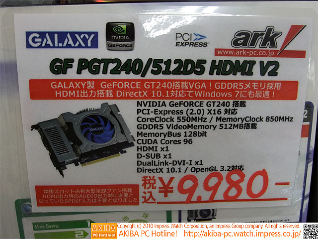 AKIBA PC Hotline! 2010年5月29日号今週見つけた新製品:ビデオカード GALAXY Microsystems GF PGT240/512D5 HDMI V2[記事に戻る]→次の画像