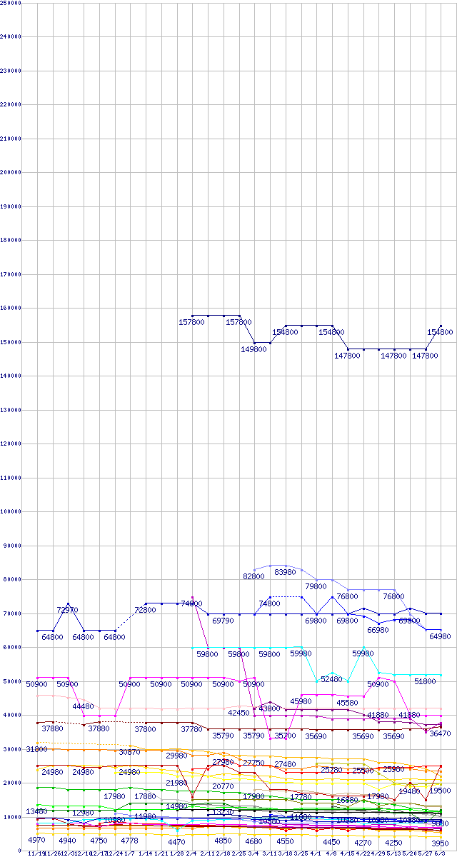 HDD/SSD主要製品の最安値推移↑前グラフ↓次グラフ(2009年11月19日〜2010年6月3日)※このグラフは過去のデータも税率5%相当に調整した税込み相当額のグラフです。 税率変更や、総額表示方式導入(2004年4月)の影響は除いています。凡例2.5インチ ミドルクラスSSD 512GB (512GB,MLC)SSDSA2SH064G1C5 (64GB,SLC)CTFDDAC256MAG-1G1 (256GB,MLC)2.5インチSSD(SandForce製コントローラ) 200GB (200GB,MLC)2.5インチ ミドルクラスSSD 256GB (256GB,MLC)SDSA2MH160G2C1/R1/R5 (160GB,MLC)2.5インチ ローエンドSSD 256GB (256GB,MLC)2.5インチSSD(SandForce製コントローラ) 100GB (100GB,MLC)CTFDDAC128MAG-1G1 (128GB,MLC)SSDSA2SH032G1 (32GB,SLC)2.5インチ ローエンドSSD 128GB (128GB,MLC)2.5インチ ミドルクラスSSD 128GB (128GB,MLC)ST32000641AS (2TB,64MB)WD2001FASS (2TB,64MB)SDSA2MH80G2C1/R1/R5 (80GB,MLC)X25-M(G2)OEM品SSD (80GB,MLC)2.5インチSSD(SandForce製コントローラ) 50GB (50GB,MLC)2.5インチ ミドルクラスSSD 64GB (64GB,MLC)WD10TPVT (1TB,8MB,12.5mm厚)2.5インチ ローエンドSSD 64GB (64GB,MLC)ST32000542AS (2TB,32MB)HDS722020ALA330 (2TB,32MB)SSDSA2MP040G2R5 (40GB,MLC)WD7500BPVT (750GB,8MB)HD203WI (2TB,32MB)WD20EARS (2TB,64MB)WD1002FAEX (1TB,64MB)HD154UI (1.5TB,32MB)WD6400BPVT (640GB,8MB)WD15EARS (1.5TB,64MB)2.5インチ ローエンドSSD 32GB (32GB,MLC)HM641JI (640GB,8MB)ST31000528AS (1TB,32MB)WD10EALS (1TB,32MB)HD103SJ (1TB,32MB)WD5000BEVT (500GB,8MB)HDS721010CLA332 (1TB,32MB)WD10EARS (1TB,64MB)HD103SI (1TB,32MB)HTS545050B9A300 (500GB,8MB)HDS721050CLA362 (500GB,16MB)※製品名をクリックすると個別のグラフを表示します※点線部は販売店が確認できなかった、または調査データがないことを示します