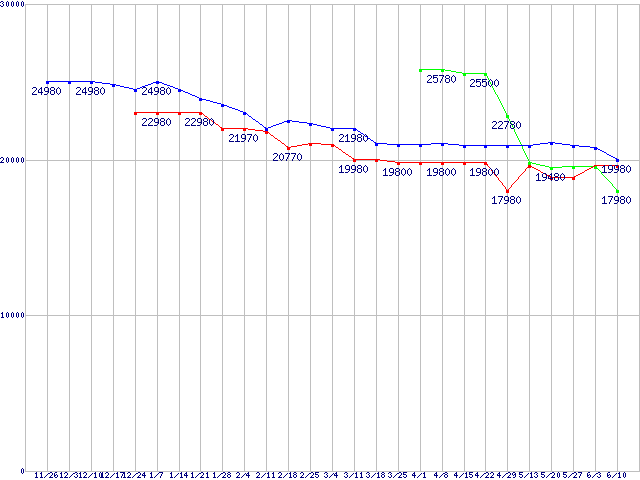 | HDD/SSD主要製品(最安値1万5千円〜2万円未満)の最安値推移 |