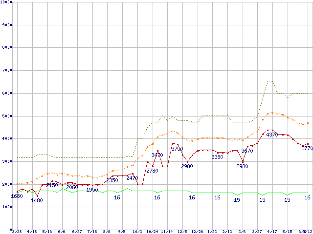 PC2-6400 2GBの価格推移↑前グラフ↓次グラフ(2009年3月28日〜2010年6月12日)※このグラフは過去のデータも税率5%相当に調整した税込み相当額のグラフです。 税率変更や、総額表示方式導入(2004年4月)の影響は除いています。●関連グラフメモリ主要製品の最安値推移2GBモジュール/1GBモジュール×2枚の最安値推移メモリ主要製品(最安値5千円未満)の最安値推移PC2-6400(DDR2-800) DDR2 SDRAM DIMMの最安値推移●凡例最安値(点線部は販売店未確認または未調査)平均値最高値ショップ数