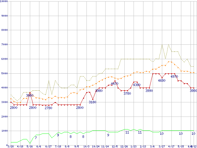 PC3-10600 2GBの価格推移↑前グラフ↓次グラフ(2009年3月28日〜2010年6月12日)※このグラフは過去のデータも税率5%相当に調整した税込み相当額のグラフです。 税率変更や、総額表示方式導入(2004年4月)の影響は除いています。●関連グラフメモリ主要製品の最安値推移2GBモジュール/1GBモジュール×2枚の最安値推移メモリ主要製品(最安値5千円未満)の最安値推移PC3-10600(DDR3-1333) DDR3 SDRAM DIMMの最安値推移●凡例最安値(点線部は販売店未確認または未調査)平均値最高値ショップ数