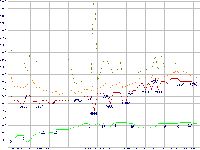 PC3-10600 2GB×2枚組みセットの価格推移↑前グラフ↓次グラフ(2009年3月28日〜2010年6月12日)※このグラフは過去のデータも税率5%相当に調整した税込み相当額のグラフです。 税率変更や、総額表示方式導入(2004年4月)の影響は除いています。●関連グラフメモリ主要製品の最安値推移4GBモジュール/2GBモジュール×2枚の最安値推移メモリ主要製品(最安値5千円〜1万円未満)の最安値推移PC3-10600(DDR3-1333) DDR3 SDRAM DIMMの最安値推移●凡例最安値(点線部は販売店未確認または未調査)平均値最高値ショップ数