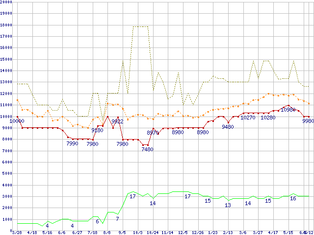 PC3-12800 2GB×2枚組みセットの価格推移↑前グラフ↓次グラフ(2009年3月28日〜2010年6月12日)※このグラフは過去のデータも税率5%相当に調整した税込み相当額のグラフです。 税率変更や、総額表示方式導入(2004年4月)の影響は除いています。●関連グラフメモリ主要製品の最安値推移4GBモジュール/2GBモジュール×2枚の最安値推移メモリ主要製品(最安値5千円〜1万円未満)の最安値推移PC3-12800(DDR3-1600) DDR3 SDRAM DIMMの最安値推移●凡例最安値(点線部は販売店未確認または未調査)平均値最高値ショップ数