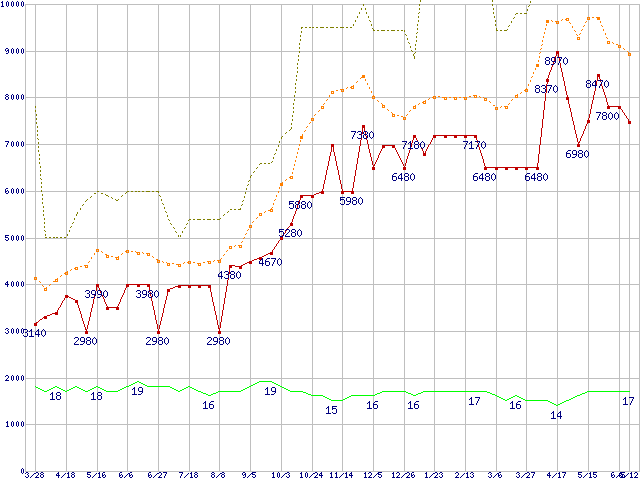 PC2-6400 2GB×2枚組みセットの価格推移↑前グラフ↓次グラフ(2009年3月28日〜2010年6月12日)※このグラフは過去のデータも税率5%相当に調整した税込み相当額のグラフです。 税率変更や、総額表示方式導入(2004年4月)の影響は除いています。●関連グラフメモリ主要製品の最安値推移4GBモジュール/2GBモジュール×2枚の最安値推移メモリ主要製品(最安値5千円〜1万円未満)の最安値推移PC2-6400(DDR2-800) DDR2 SDRAM DIMMの最安値推移●凡例最安値(点線部は販売店未確認または未調査)平均値最高値ショップ数