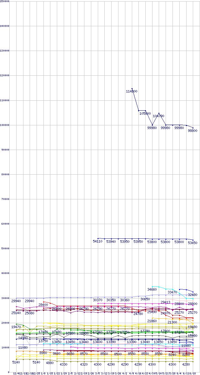 CPU主要製品の最安値推移↑前グラフ↓次グラフ(2009年12月4日〜2010年6月18日)※このグラフは過去のデータも税率5%相当に調整した税込み相当額のグラフです。凡例Core i7-980X Extreme Edition (3.33GHz)Core i7-960 (3.20GHz)Core i7-875K (2.93GHz)Core 2 Quad Q9650 (3.00GHz,L2 6MB×2)Phenom II X6 1090T Black Edition (3.2GHz,L2 512KB×6,L3 6MB,TDP 125W)Core i5-680 (3.6GHz)Core i7-930 (2.80GHz)Core i7-860 (2.80GHz)Core 2 Quad Q9550 (2.83GHz,L2 6MB×2)Core 2 Duo E8600 (3.33GHz,L2 6MB)Core i5-750S (2.4GHz)Core i5-670 (3.46GHz)Core i5-655K (3.2GHz)Phenom II X6 1055T (2.8GHz,L2 512KB×6,L3 6MB,TDP 125W)Core i5-661 (3.33GHz)Core i5-660 (3.33GHz)Core i5-750 (2.66GHz)Core 2 Duo E8500 (3.16GHz,L2 6MB)Core i5-650 (3.2GHz)Phenom II X4 965 Black Edition (3.4GHz,L2 512KB×4,L3 6MB,TDP 125W)Phenom II X4 910e (2.6GHz,L2 512KB×4,L3 6MB,TDP 65W)Core 2 Quad Q8400 (2.66GHz,L2 2MB×2)Core 2 Duo E8400 (3GHz,L2 6MB)Phenom II X4 955 Black Edition (3.2GHz,L2 512KB×4,L3 6MB,TDP 125W)Core i3-550 (3.20GHz)Phenom II X4 945 (3.0GHz,L2 512KB×4,L3 6MB,TDP 95W)Core 2 Duo E7600 (3.06GHz,L2 3MB)Core i3-540 (3.06GHz)Athlon II X4 640 (3.0GHz,L2 512KB×4,TDP 95W)Core 2 Duo E7500 (2.93GHz,L2 3MB)Core i3-530 (2.93GHz)Athlon II X4 635 (2.9GHz,L2 512KB×4,TDP 95W)Phenom II X2 555 Black Edition (3.2GHz,L2 512KB×2,L3 6MB)Pentium E6700 (3.20GHz,L2 2MB)Pentium G6950 (2.8GHz)Athlon II X3 440 (3.0GHz,L2 512KB×3,TDP 95W)Pentium E6600 (3.06GHz,L2 2MB)Athlon II X2 260 (3.2GHz,L2 1MB×2,TDP 65W)Pentium E6500 (2.93GHz,L2 2MB)Athlon II X2 255 (3.1GHz,L2 1MB×2,TDP 65W)Athlon II X2 240e (2.8GHz,L2 1MB×2,TDP 45W)Athlon II X2 250 (3.0GHz,L2 1MB×2,TDP 65W)Celeron E3400 (2.6GHz)Celeron E3300 (2.5GHz)※製品名をクリックすると個別のグラフを表示します※点線部は販売店が確認できなかった、または調査データがないことを示します