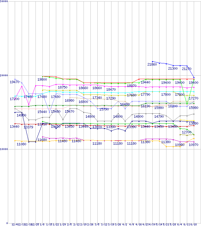 CPU主要製品(最安値1万円〜2万円未満)の最安値推移↑前グラフ↓次グラフ(2009年12月4日〜2010年6月18日)※このグラフは過去のデータも税率5%相当に調整した税込み相当額のグラフです。凡例Phenom II X6 1055T (2.8GHz,L2 512KB×6,L3 6MB,TDP 125W)Core i5-661 (3.33GHz)Core i5-660 (3.33GHz)Core i5-750 (2.66GHz)Core 2 Duo E8500 (3.16GHz,L2 6MB)Core i5-650 (3.2GHz)Phenom II X4 965 Black Edition (3.4GHz,L2 512KB×4,L3 6MB,TDP 125W)Phenom II X4 910e (2.6GHz,L2 512KB×4,L3 6MB,TDP 65W)Core 2 Quad Q8400 (2.66GHz,L2 2MB×2)Core 2 Duo E8400 (3GHz,L2 6MB)Phenom II X4 955 Black Edition (3.2GHz,L2 512KB×4,L3 6MB,TDP 125W)Core i3-550 (3.20GHz)Phenom II X4 945 (3.0GHz,L2 512KB×4,L3 6MB,TDP 95W)Core 2 Duo E7600 (3.06GHz,L2 3MB)Core i3-540 (3.06GHz)Athlon II X4 640 (3.0GHz,L2 512KB×4,TDP 95W)Core 2 Duo E7500 (2.93GHz,L2 3MB)Core i3-530 (2.93GHz)※製品名をクリックすると個別のグラフを表示します※点線部は販売店が確認できなかった、または調査データがないことを示します