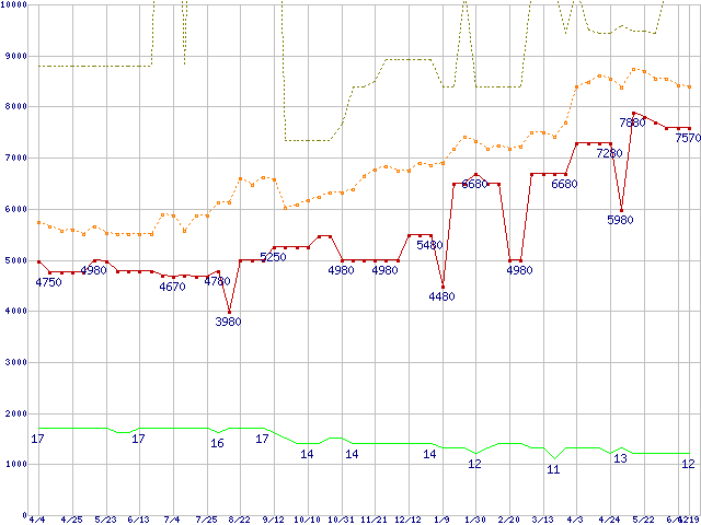 PC3-10600 1GB×3枚組みセットの価格推移↑前グラフ↓次グラフ(2009年4月4日〜2010年6月19日)※このグラフは過去のデータも税率5%相当に調整した税込み相当額のグラフです。 税率変更や、総額表示方式導入(2004年4月)の影響は除いています。●関連グラフメモリ主要製品の最安値推移メモリ主要製品(最安値5千円〜1万円未満)の最安値推移PC3-10600(DDR3-1333) DDR3 SDRAM DIMMの最安値推移●凡例最安値(点線部は販売店未確認または未調査)平均値最高値ショップ数